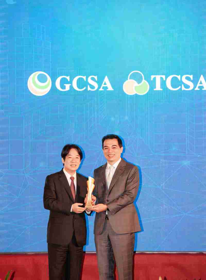 达全方位永续表现获全球永续奖及台湾永续奖肯定,,由副总统赖清德颁奖 (左),,,冰球突破总经理柯富仁 (右) 代表领奖
