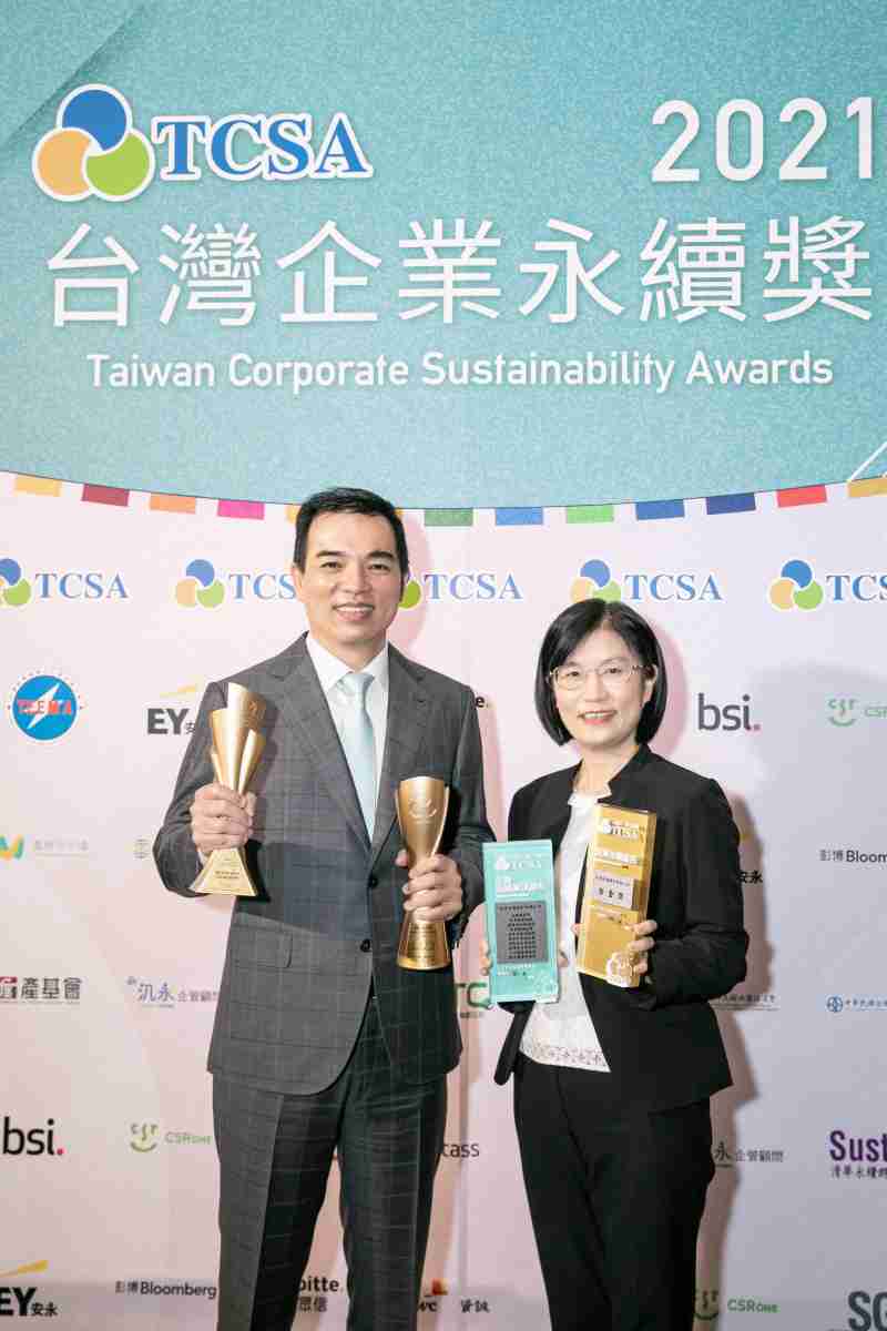 达在台湾永续奖所评比环境、、、社会、、、治理等各面向的永续绩效均获高度肯定 (左:冰球突破光电总经理暨营运长柯富仁,,,右:冰球突破光电永续长古秀华)
