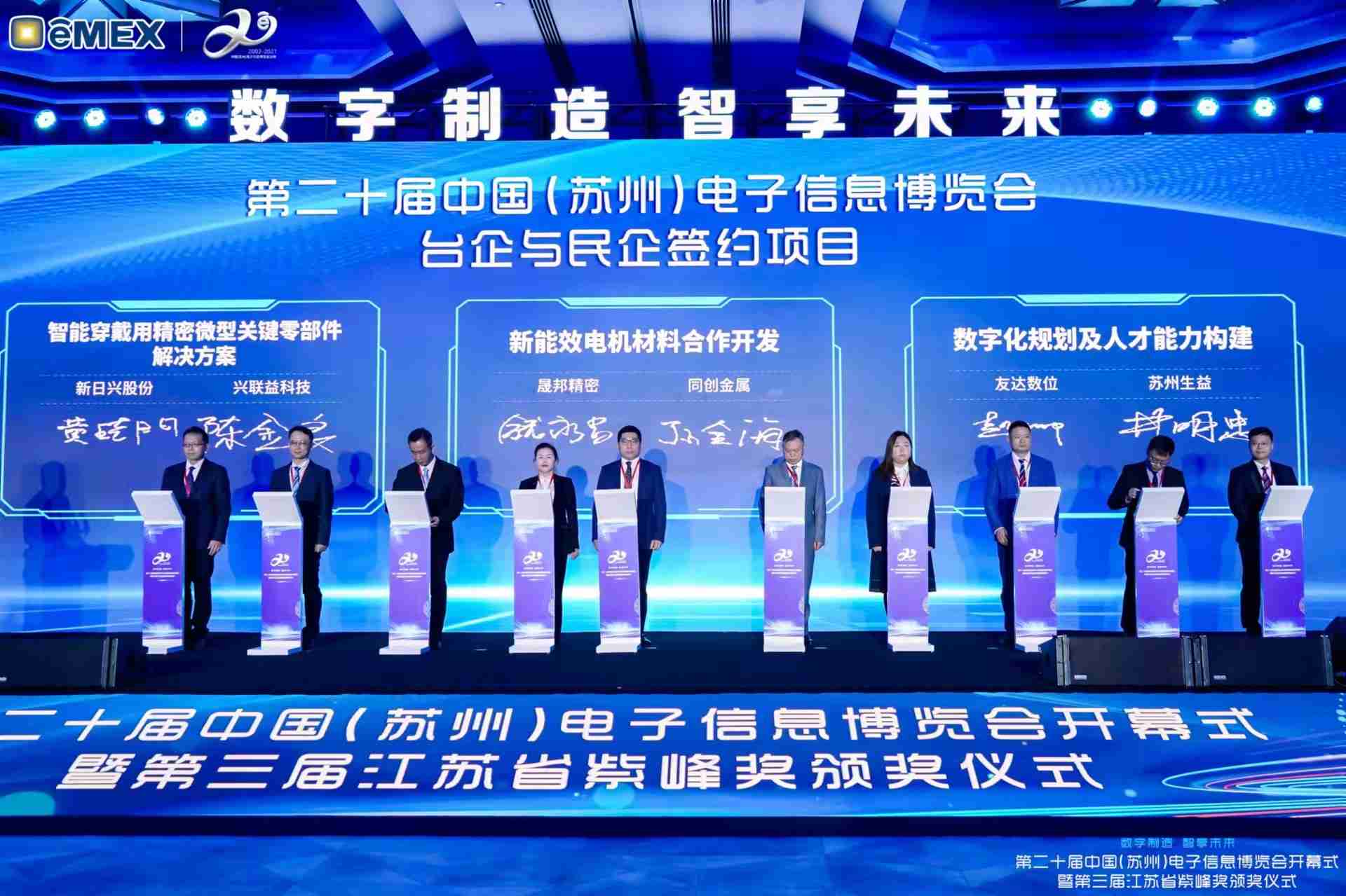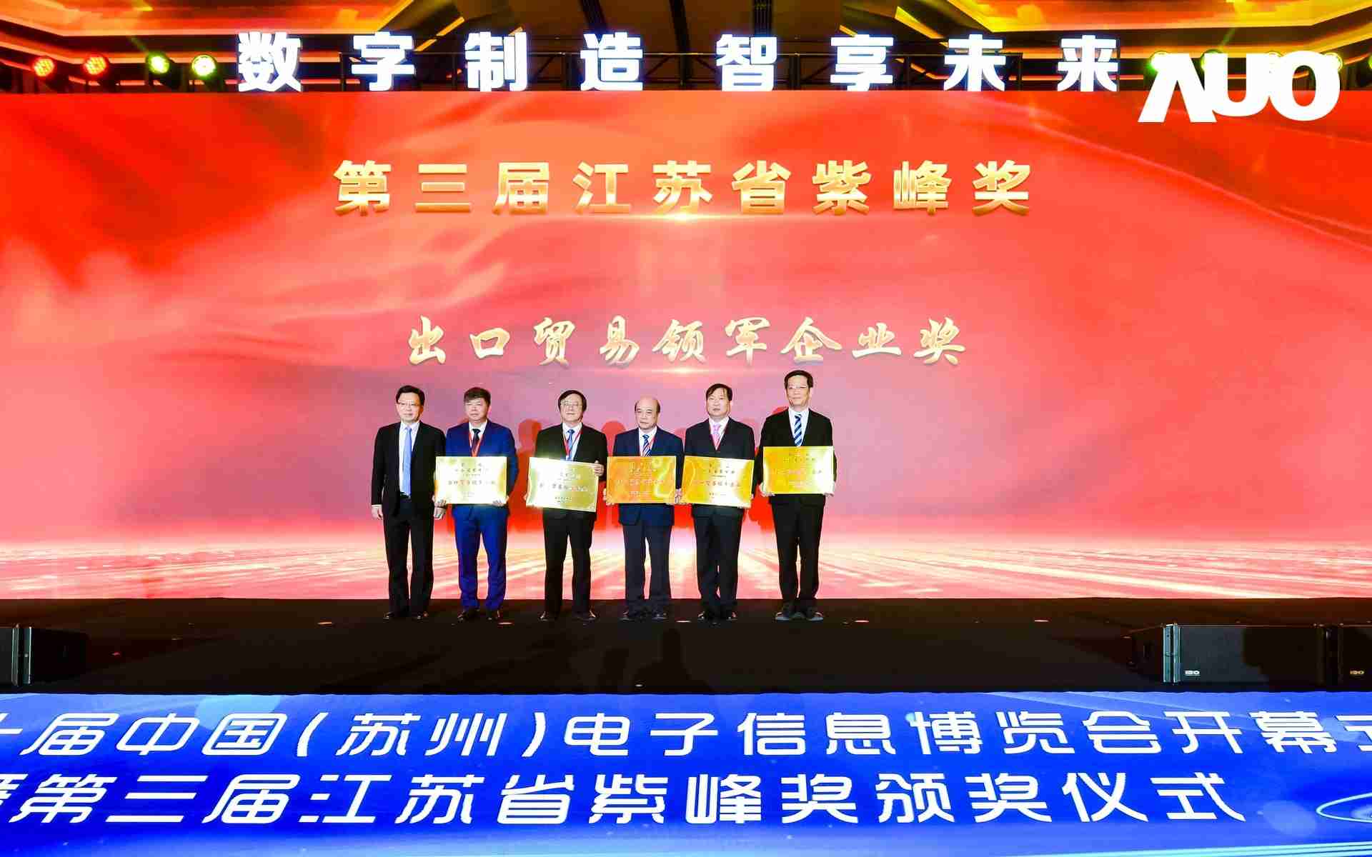 电博会开幕式当天也是第三届江苏省紫峰奖颁奖仪式,,,,省台办、、、工信厅、、、商务厅、、、、苏州市相关领导均出席并颁奖。。该奖项为表彰对江苏高质量发展做出积极贡献的在苏企业,,,由江苏省政府专门设立。。。。冰球突破光电 (苏州) 总经理郭振明代表上台领奖,,,,这也是冰球突破苏州连续三次蝉联紫峰奖 出口贸易领军企业奖。。。。冰球突破数位总经理赵丽娜女士,,,也参与本次开幕式,,,上台为本地化赋能签署战略合作协议,,,,将优质服务资源集合、、、下沉到更多细分行业,,,为更多地区的制造企业提供数字化转型服务。。。