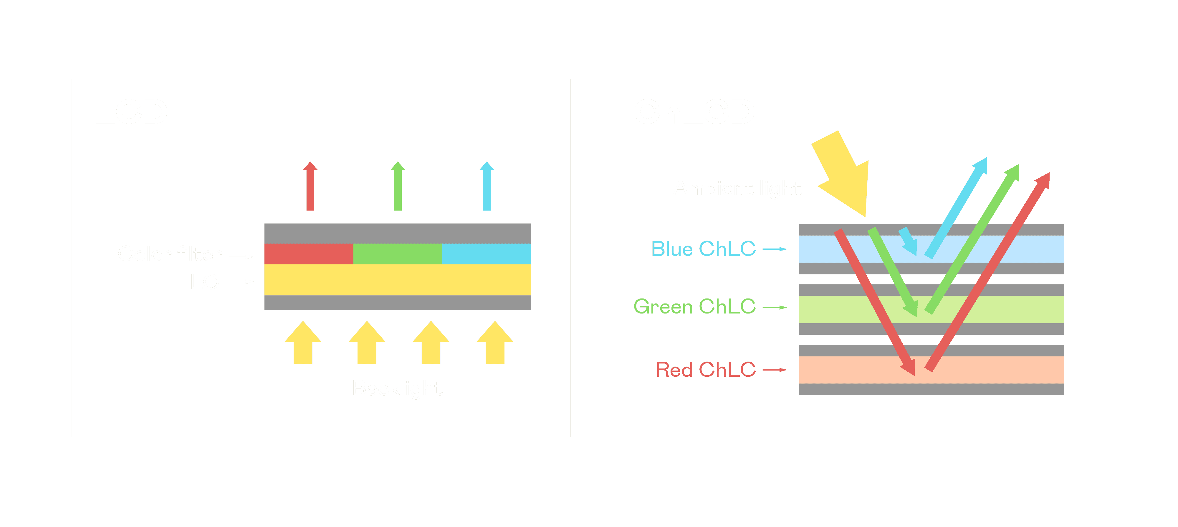 ChLCD 胆固醇液晶就如同纸张一样,,,,透过反射环境光来显示影像,,因此长时间观看不易造成人眼视觉疲劳,,,可达到护眼效果。。当处于户外阳光下使用,,LCD 影像容易失真而不易观看,,但胆固醇液晶仍可维持较佳的影像品质。。