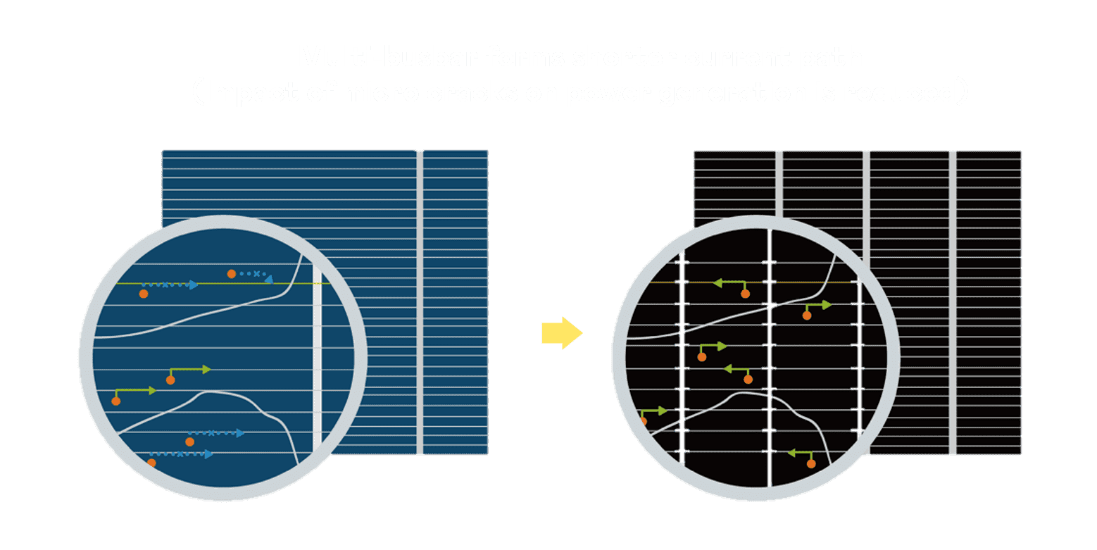 • 电池使用多条铜导线 (Copper wire) 于电池片上形成较短的电流路径,,提高电流收集效率,,,,采用圆形设计的铜导线较传统扁平式的铜焊带 (Ribbon),,,,可增加入射至电池的光线量。。