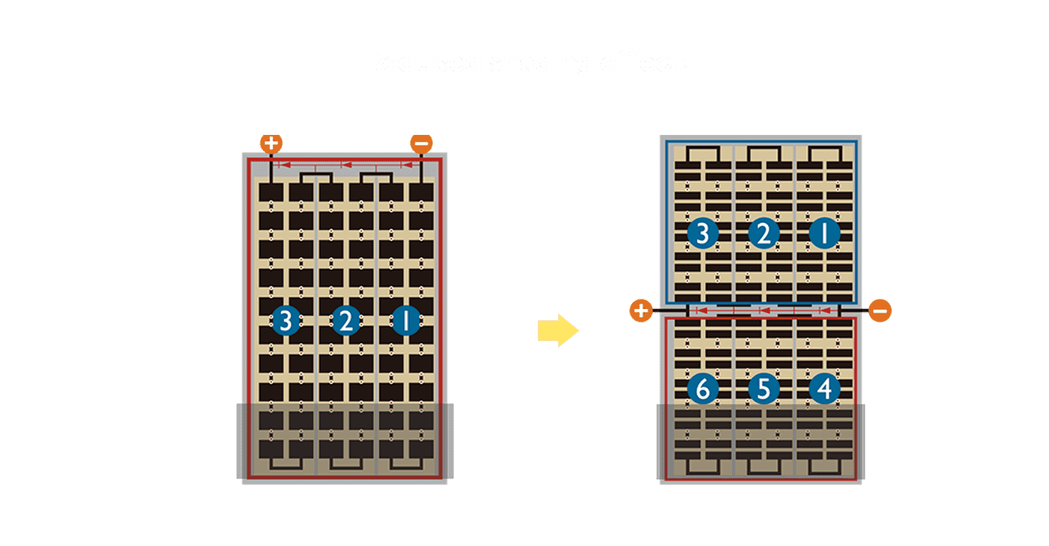 • 结合半切电池,,,降低遮阴影响、、、、提升模组抗隐裂能力、、、、并减少电阻损耗,,,进一步提升模组发电效能。。。